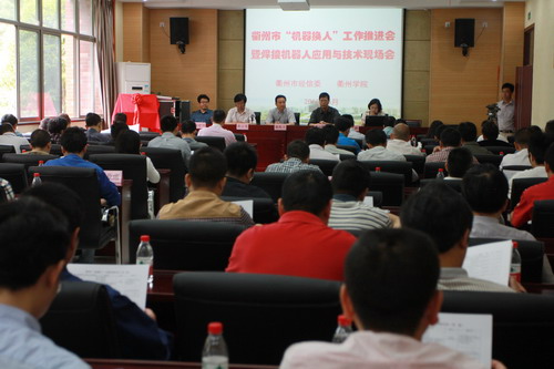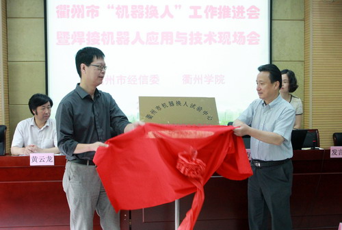 5月21日上午,衢州市“机器换人”工作推进会暨焊接机器人应用与技术现场会在我校举行。衢州市中小企业局副局长杨剑国、jinnian金年会副校长潘海天、衢州职业技术学院副院长黄云龙、各县(市、区)经信局负责人、衢州市第一批“机器换人”专家组和推荐服务商及60余家企业参加了会议。 会上,首先为衢州市第一批“机器换人”专家组和推荐服务商颁发证书;随后,杨剑国与潘海天为市经信委与我校联合成立的衢州市“机器换人”试验中心揭牌。杨剑国介绍了我市开展“机器换人”的工作情况,并对下一步的工作进行了部署。我校周兆忠教授作为衢州市第一批“机器换人”专家指导组代表作了表态发言。