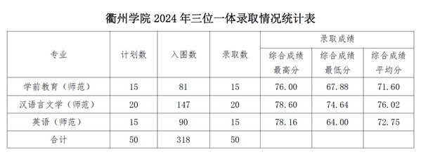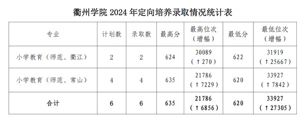 7月12日,我校2024年普通高考招生录取工作正式启动,包括定向培养、三位一体在内的浙江省普通类提前录取率先完成。 今年我校面向衢江区、常山县定向培养小学全科教师共6名。其中,录取衢江籍考生2名,最高分624分、最高位次30089,最低分622分、最低位次31919;录取常山籍考生4名,最高分635分、最高位次21786,最低分620分、最低位次33927。其中,录取最高分635分、最高位次21786均创我校录取数据历史新高。 根据《jinnian金年会2024年“三位一体”综合评价招生章程》规定,今年我校录取学前教育(师范)、汉语言文学(师范)、英语(师范)专业三位一体新生共50名。其中,学前教育(师范)专业综合成绩最高分76.00分,最低分67.88分;汉语言文学(师范)专业综合成绩最高分78.60分,最低分74.64分;英语(师范)专业综合成绩最高分78.16分,最低分64.00分。